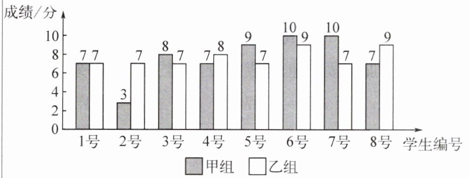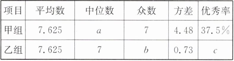 (2) 理由不唯一,例如:①甲组成绩的优秀率为37.5%,高于乙组成绩的优秀率25%,所以从优秀率的角度看,甲组成绩比乙组好;②甲组成绩的中位数为7.5,高于乙组成绩的中位数,所以从中位数的角度看,甲组成绩比乙组好.因此不能仅从平均数的角度说明两组成绩一样好,可见,小祺的观点比较片面.