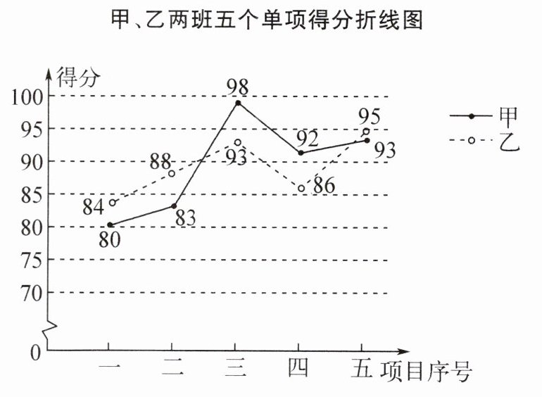 (2) 乙 提示:甲班团体最终成绩为$80+83+98+92+93=446$(分),用计算器计算甲班五个单项得分的方差为 44.56 分²;乙班团体最终成绩为$84+88+93+86+95=446$(分),乙班的方差为17.36 分²;丙班团体最终成绩为$78+83+94+90+92=437$(分).$437<446,44.56>17.36$,所以乙班获得团体比赛冠军.