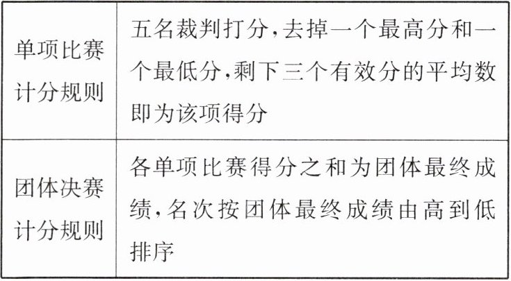 |单项比赛计分规则|五名裁判打分,去掉一个最高分和一个最低分,剩下三个有效分的平均数即为该项得分|