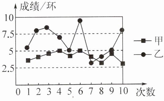2. (2024 兰州市中考)甲,乙两人在相同条件下各射击 10 次. 两人的成绩(单位:环)如图所示. 现有以下三个推断: