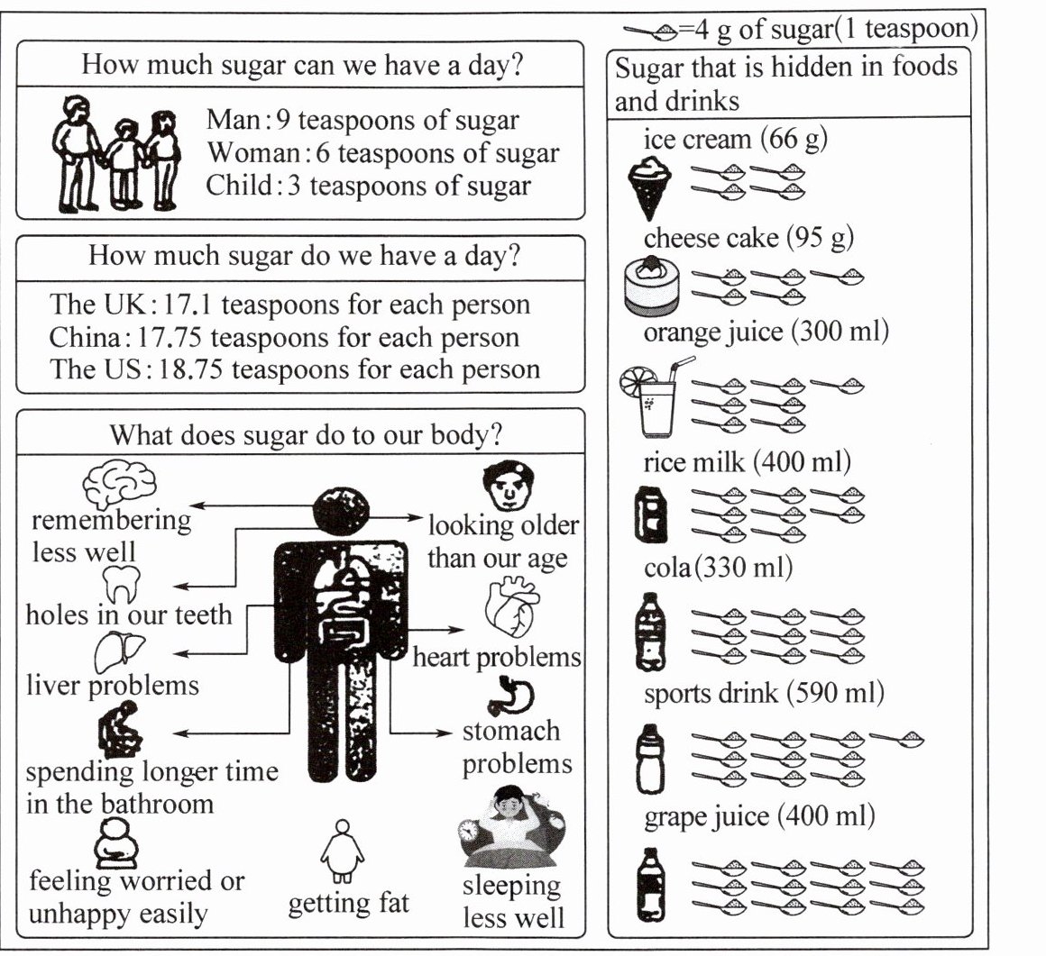 1. A 提示:细节理解题。根据“How much sugar can we have a day?”一栏中“Child: 3 teaspoons of sugar”可知,一个5岁的男孩子一天可以摄入3茶匙糖。