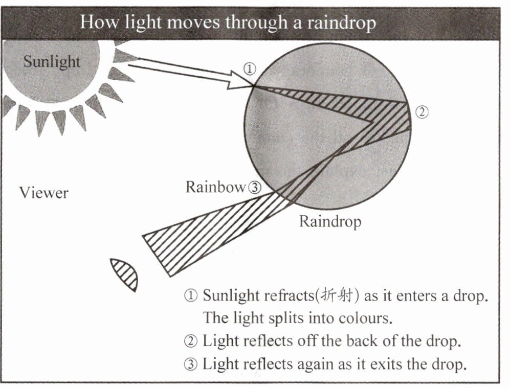 1. Which sentence below can best explain the underlined sentence "Rainbows are beautiful tricks of light" in Paragraph 1?