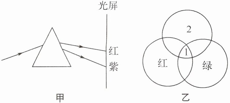 ,图乙为色光三原色的示意图,图中区域 1 应标白