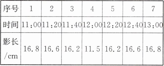 【设计并完成实验】今年国庆节,小明带领学习小组成员,将自制的圭表放在太阳光下的水平地面上,用来研究一天中影子随时间变化的规律。8:00—16:00 之间,每隔 1 小时,在薄木板上画出铅笔的影子,在 11:00—13:00 之间,每隔 20 分钟,在铅笔影子的顶端做一个记号,测量影长并记录在下表中。