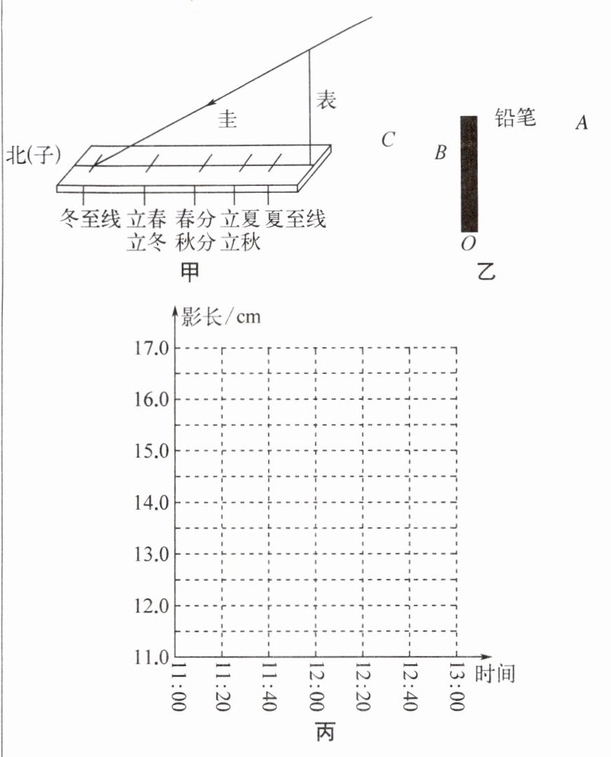(2)如图乙所示,是小明同学在水平板上记录的 8:00、12:00、16:00 时铅笔的影子,其中 B 点在 O 点的______(填“东”“西”“南”或“北”)侧,OA 是______(填“8:00”“12:00”或“16:00”)时铅笔的影子。