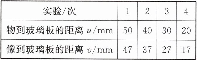 (2)由图乙和表中数据可知,像距和物距大小不相等,可能像距测量错误,忽略了玻璃板的厚度。由表中数据可知,像距与物距相差3mm,则玻璃板的厚度为3mm。