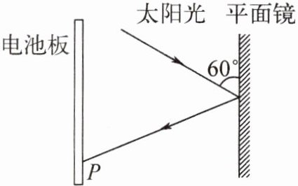 4. (2024·镇江丹徒月考)小明在房间中安装了一块太阳能电池板给家里供电。当太阳在电池板后方时,利用一块平面镜将太阳光反射到太阳能电池板上。若某时刻太阳光与平面镜的夹角为 60°(如图所示),一束太阳光经镜面反射后照射到电池板上的 P 点,入射角的大小为