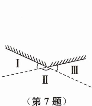 7. 如图所示,有两个反射面成钝角的平面镜,镜前放一个物体要产生两个虚像,则物体可以放在 区;在镜前观看,不能同时看到两个虚像所在的区域是 区。