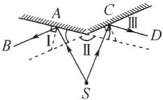 Ⅱ Ⅰ、Ⅱ、Ⅲ 提示:物体发出或反射的光线能够射到镜面上,物体就可以通过镜面成像,所以物体在Ⅰ或Ⅲ区域时,只能通过镜面的左侧或右侧部分成像,即物体只能成一个虚像;而物体在Ⅱ区域时,可以通过镜面的左侧和右侧部分同时成像,即可以产生两个虚像。若经过镜面反射的光线能够进入眼睛,眼睛就可以看到镜中的像,当人在Ⅰ区域时,不能看到右侧平面镜所成的虚像,同理,当人在Ⅲ区域时,不能看到左侧平面镜所成的虚像;如图所示,在Ⅱ区域的某一发光点S,经两个反射面反射后的反射光线AB、CD不能交于一点,则在Ⅱ区域也不能同时看到两个虚像。所以Ⅰ、Ⅱ、Ⅲ三个区域都不能看到两个虚像。