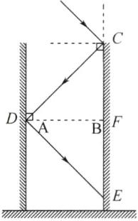 (1)如图所示,∠CDF等于反射角等于入射角,在△DCF中,DF = CF = 0.3m,所以每反射一次,光线下移30cm,发生反射的次数n = $\frac{3.95m}{0.3m}$≈13.17,所以包括在C点的反射,一共发生14次反射。
