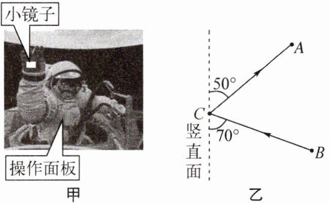 7. 航天员舱外作业时,宽厚的航天服限制了他的视野,为了看清胸前的操作面板,可以通过手腕处的小镜子(图甲)进行观察。图乙中A点代表航天员的眼睛,B点代表胸前某一按钮,C点是小镜子的位置,请你根据反射光路图在C点准确画出镜面并标出镜面与竖直面的夹角。(保留作图痕迹)