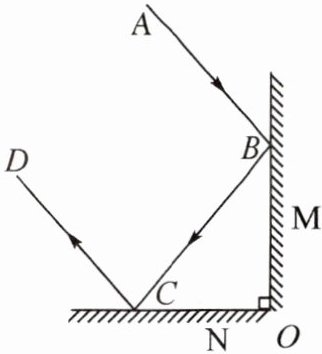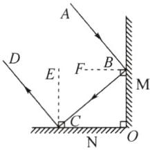 6. 光学知识在生活中有很多应用,比如自行车的角反射器的一部分是由两个相互垂直的平面镜组成,如图所示,任何方向的一束光线射到其中一块平面镜上,经两次反射后,光线恰好按照原来的方向返回,以提醒司机前方有人。当一束光AB与平面镜M成40°角入射时,光线BC在平面镜N上反射时的入射角为______°。若保持入射光线AB的方向不变,将平面镜组合绕O点顺时针旋转10°,则最后射出的光线CD转过的角度是______°。
