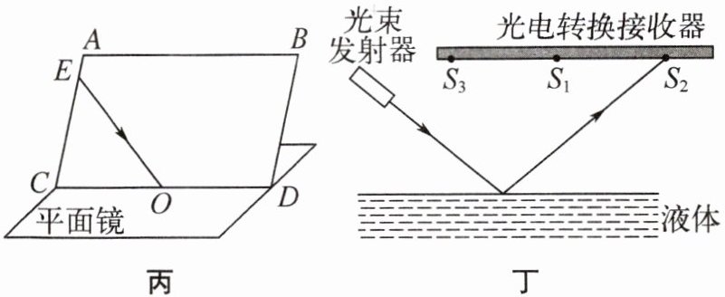 (5)有一种液面微变监视器,基本原理图如图丁所示,光束发射器始终以一定角度向被监视的液面发射一束细光束,光束经液面反射后被光电转换接收器接收,若光电转换接收器接收到的光点从$S_1$移到$S_2,$说明液面______(填“上升”或“下降”)了,则光斑移动距离的大小与接收平面到液面之间的距离______(填“有”或“没有”)关系。