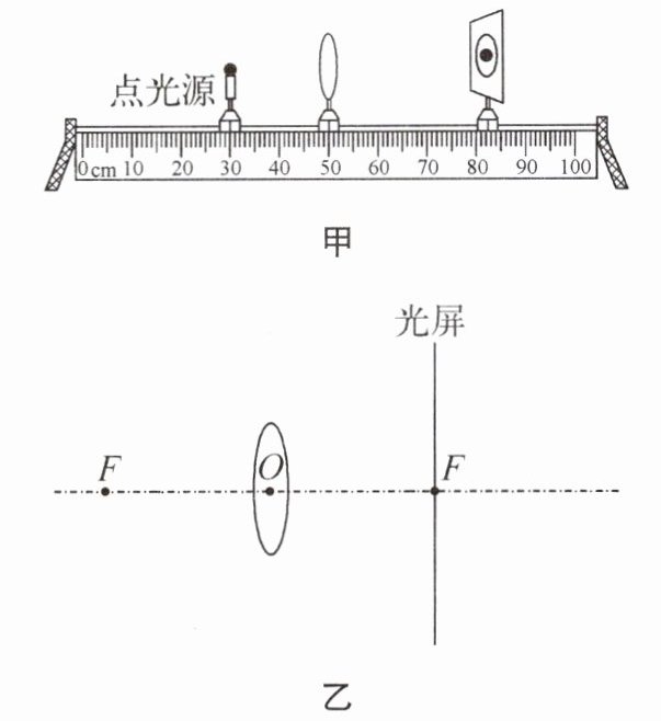 9. 小明学习了凸透镜后,进行了课外的探究。他将一可变色的点光源、横截面积为 S 的凸透镜和光屏(面积足够大)放在光具座(一种能显示长度刻度的光学器件)上,如图甲所示,调节它们的高度,使光源、凸透镜光心和光屏中心在同一水平直线上。