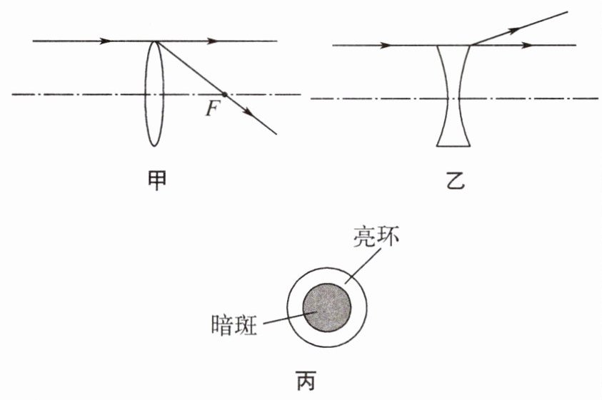 7. 小明在暗室里探究平行于主光轴的光通过透镜后的光路,他用一直径和透镜直径相同的平行光正对透镜照射,惊奇地发现通过透镜玻璃边缘的光经透镜后部分发生偏折,部分沿直线传播,如图甲和乙所示。第二天小明在阳光下继续研究透镜对光的作用,将透镜正对太阳光,移动与透镜平行的白纸,在白纸上得到了如图丙所示的现象。则该同学所用的透镜为