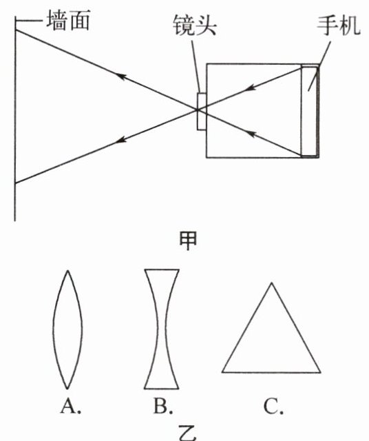 7. 图甲是小林同学设计制作的手机投影仪示意图,它可将手机画面放大投影到墙面上。