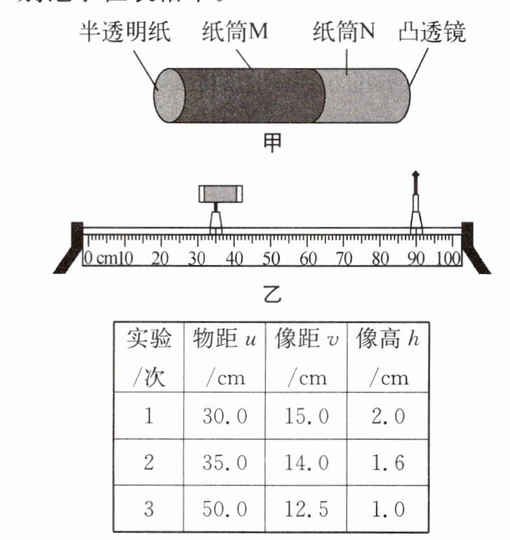 8. 创新活动中,小明自制了一台简易照相机模型,如图甲所示。模型由两个纸筒M、N组成,M正好套在N的外面,并能进行抽拉。在纸筒M的一端贴上半透明纸,凸透镜(焦距为10 cm)固定在纸筒N的一端。然后小明与同学们一起利用自制照相机模型研究照相机的成像原理,如图乙所示,将此模型和LED灯制成的发光体(物高H= 4 cm)固定在光具座上进行实验,并将每次实验测得的物距u、像距v、成像情况等分别记录在表格中。