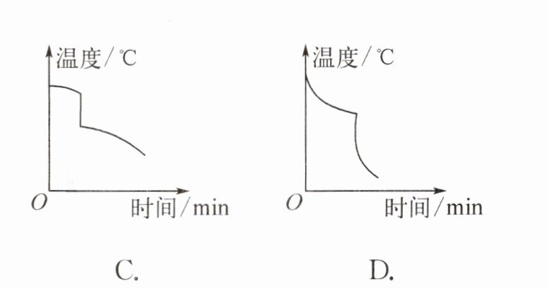 3. (2023·南通通州期中)小明从热水瓶中倒出半杯热水,一段时间后发现水仍很烫,于是又倒入一些冷水,水温下降到适宜饮用的温度。下面能反映整个过程中水的温度随时间变化的图像是 (