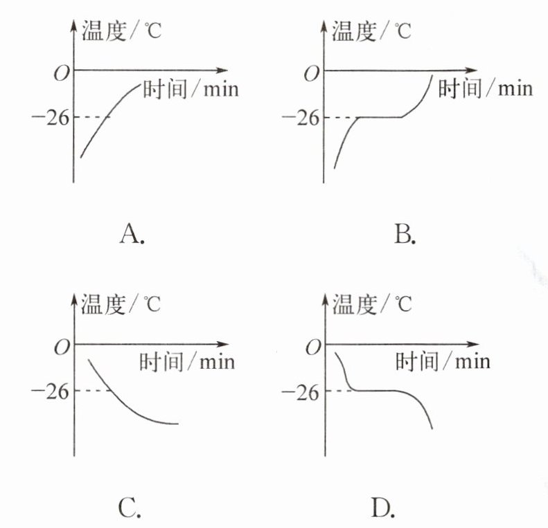 1.(2024·徐州东苑中学月考)在“祝融号”火星车的顶部,有一个集热器装置,里面装有一种叫“正十一烷”的物质。该物质的熔点为-26°C 。其凝固时温度随时间变化的图像为图中的(