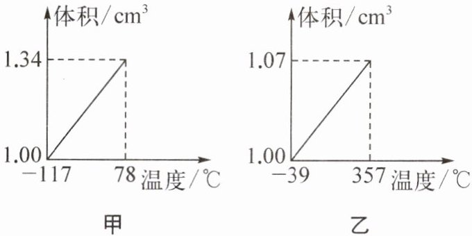 乙 甲 B 提示:由图可知,甲的沸点是$78^{\circ }C$,乙的沸点是$357^{\circ }C$,1标准大气压下沸水的温度是$100^{\circ }C$,因此测量沸水的温度计要用乙作感温液体;甲的凝固点是$-117^{\circ }C$,乙的凝固点是$-39^{\circ }C$,在北极气温可达$-50^{\circ }C$以下,只有甲是液态的,因此北极科考站的温度计的感温液体应选用甲。分析图像可知,升高相同温度时甲增大的体积大于乙,即甲比乙的热胀冷缩程度更明显,所以温度每升高$1^{\circ }C$,感温液体上升的高度相同时,乙作测温物质的B温度计细玻璃管的内径稍小。