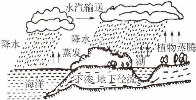 9. 如图所示是大自然中水循环的示意图。江、河、湖、海以及大地表层中的水不断蒸发变成水蒸气,当含有很多水蒸气的空气升入高空时,水蒸气的温度降低①凝成小水滴或②凝成小冰晶,这就是云。在一定条件下,云中的小水滴和小冰晶越来越大,就会下落。在下落过程中,小冰晶又变成小水滴,与原来的水滴一起落到地面,这就形成了雨。