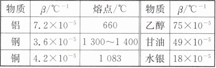 (2)查阅资料发现:不同物质的热膨胀程度不同,这可以用体膨胀系数β来表示。下表是在其他条件不变时,某些固体、液体在接近室温时的体膨胀系数及部分金属的熔点。