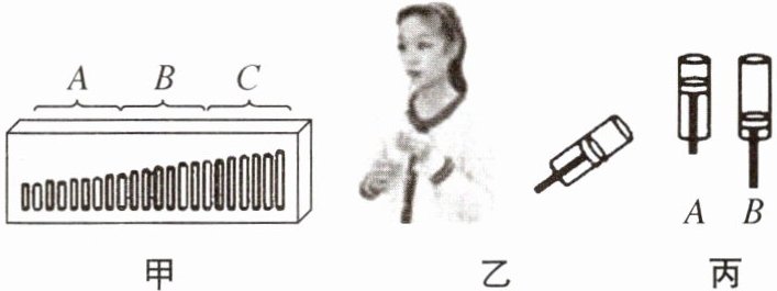振动而产生的,吹哨时上下推拉活塞,图丙中A和B音调较高的是A