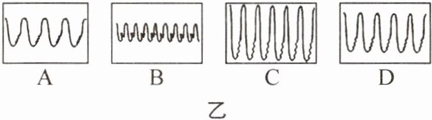 3. 编钟是我国出土的春秋战国时期的乐器,声音悦耳动听。现有四口编钟,如图甲所示。其中有一口编钟上有一隐形的裂痕,为了查找出这口编钟,用锤子分别敲击它们,将所产生的声波输入示波器中,图乙四幅图为示波器中显示的对应编钟的波形图,则敲