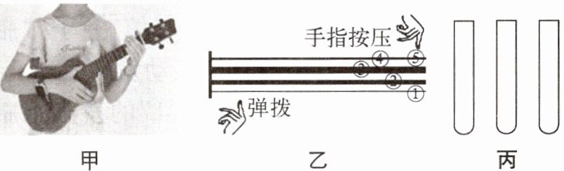 5. 热爱音乐的小科自学了尤克里里(图甲),他观察到尤克里里有四根粗细不同的琴弦(图乙),按压琴弦的不同位置,会改变音调的高低。那琴弦音调的高低与琴弦粗细、长短有什么关系呢?小科决定用实验来求证。