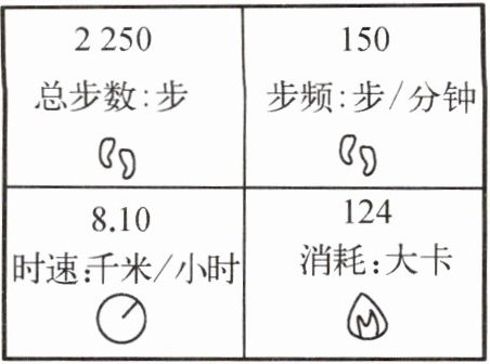 15 2.025 0.9 提示:由数据截图可知,跑步步数为2250步,步频为150步/min,跑步时间$ t=\frac{2250\ \text{步}}{150\ \text{步/min}}=15\ \text{min}=0.25\ \text{h} $,通过的路程$ s=vt=8.10\ \text{km/h}×0.25\ \text{h}=2.025\ \text{km}=2025\ \text{m} $,每跑一步的平均长度$ L=\frac{2025\ \text{m}}{2250}=0.9\ \text{m} $。
