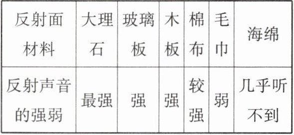 (5)根据实验结果,反射声音的强弱与反射面的材料有关。具体来说,表面越光滑的材料,反射声音的能力越强;而表面越粗糙的材料,反射声音的能力越弱。由于天坛回音壁的设计目的是为了增强声音的反射和回音效果,因此可以合理推测,其表面应该比较光滑,以便更好地反射声音。