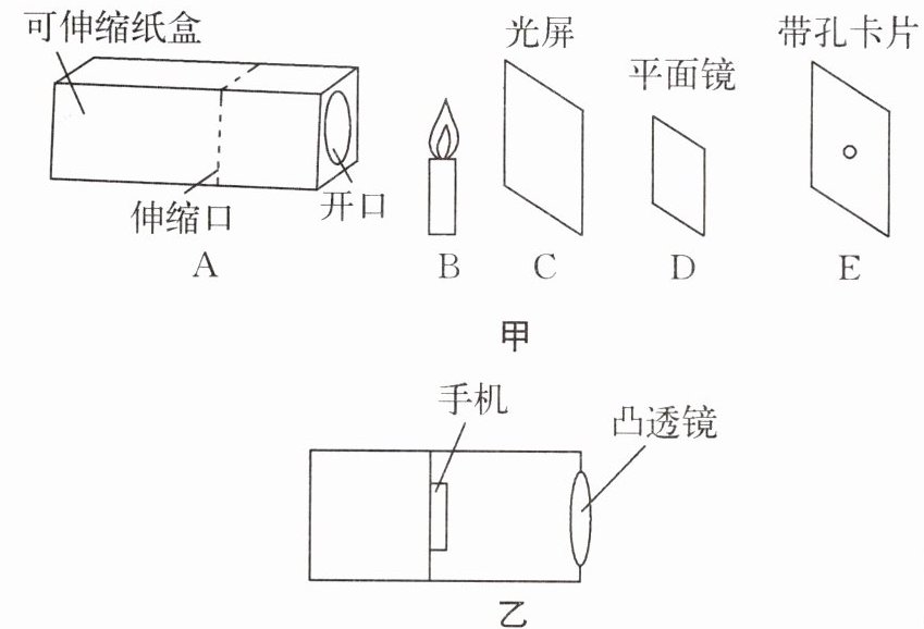 (3)用装置A制作成模拟投影仪时,在伸缩口处加上可移动纸板,纸板上固定手机,原来的开口处装入凸透镜,其截面图如图乙所示,在制作过程中,手机和凸透镜间距相当于
