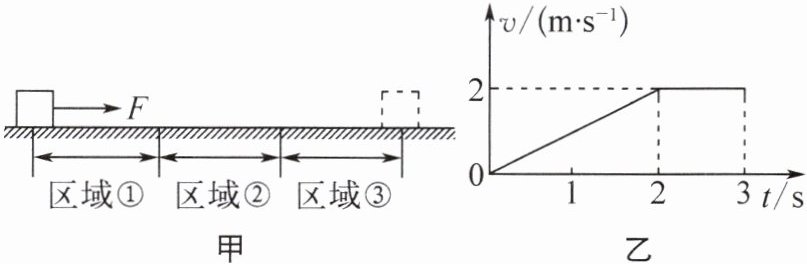1. (2024·盐城建湖期中)如图甲所示,水平路面由三段长度相等的粗糙区域组成。在2 N的水平拉力F的作用下,物块(体积忽略不计)从区域①的最左端由静止开始运动,在刚进入区域③时撤去拉力,物块最终停在区域③的最右端。图乙为物块在区域①和②上运动的v-t图像,则 (