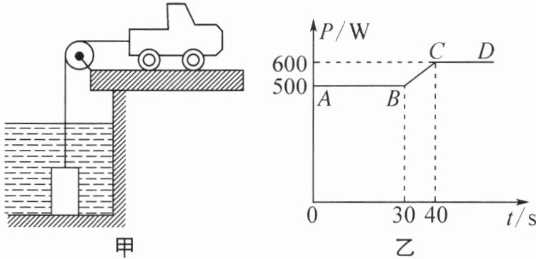 4. (2024·南通如皋期中)如图甲所示是使用汽车打捞水库中重物的示意图。汽车通过定滑轮牵引水下一个质量分布均匀的圆柱体重物,在整个打捞过程中,汽车以恒定的速度$v= 0.2m/s$向右运动。图乙是此过程中汽车功率P随时间变化的图像。设$t= 0$时汽车开始提升重物,忽略水的阻力和滑轮的摩擦,g取10 N/kg。下列说法正确的是 (
