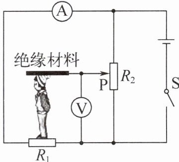 C 提示:图中$R_{1}$与$R_{2}$并联,电压表测$R_{2}$滑片P下方电阻丝两端的电压,滑片移动时,$R_{2}$接入电路中的电阻不变,通过$R_{2}$的电流不变;人的身高越高,滑片越向上移动,与电压表并联部分的电阻变大,电压表示数变大,当人的身高偏低时,电压表测导线两端的电压,示数为0;$R_{1}$的阻值与重力G成反比,设$R_{1}G=k$,则$R_{1}=\frac{k}{G}$,$I=\frac{U}{R_{1}}=\frac{U}{\frac{k}{G}}=\frac{U}{k}\cdot G$,可知I与G成正比。