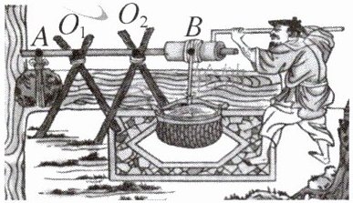 7.(2024·无锡中考)如图是《天工开物》中记载的我国古代的提水工具“辘轳”,在两个支架上摆放一根直的硬棒,支点为$O_1、$$O_2,A$端系一石块,B端装有轮轴,轮轴能绕着硬棒转动,悬吊空桶的绳索另一端绕过轮轴后系紧在轮轴上,若空桶质量为10 kg,轮轴质量为10 kg,空桶和轮轴对硬棒的作用力视作施加在B位置。$O_1A$长为$0.6 m,O_1O_2$长为$1 m,O_2B$长为0.8 m,硬棒及绳索质量忽略不计。(g取10 N/kg)