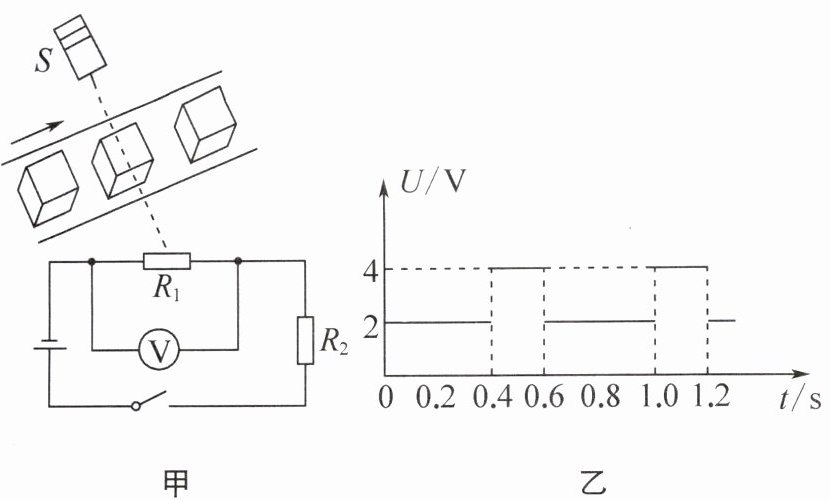 6. 如图甲是某生产流水线上均匀正方体产品的输送及计数装置示意图,其中S为激光源$,R_1$为光敏电阻(有光照射时,阻值较小;无光照射时,阻值较大$),R_2= 400 Ω。$水平传送带匀速前进,每当传送带上的产品通过S与$R_1$之间时,射向光敏电阻的光线会被产品挡住。电压表示数随时间变化的关系如图乙所示。已知电源电压恒为6 V,则有光照射时光敏电阻$R_1$的阻值为