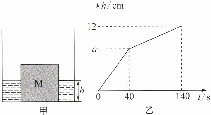 3.(2024·无锡宜兴期中)如图甲所示,水平放置的方形容器里有一个重为8 N、棱长为10 cm的正方体物块M,M与容器底部不密合。以5 mL/s的恒定水流向容器内注水,容器中水的深度$h随时间t$的变化关系如图乙所示,下列选项正确的是( )