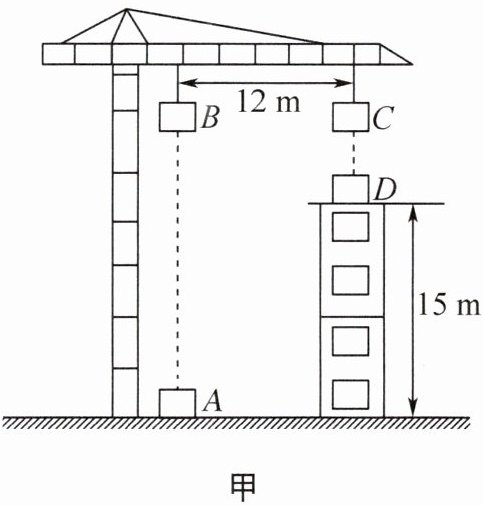 11. 如图甲所示,吊机将重为6000N的货物从地面$A$处竖直匀速提升40s到达$B处再水平匀速运送到C$处,最后竖直向下放到楼顶$D$处。货物从$C处到D$处用时50s,路程随时间变化的图像如图乙所示,不计空气阻力。求: