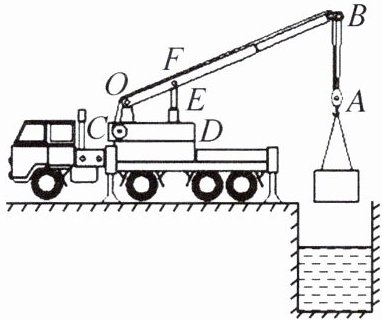 12. 如图所示是液压汽车起重机从水中打捞重物的示意图,$A$是动滑轮,$B$是定滑轮,$C$是卷扬机,$D$是油缸,$E$是柱塞。作用在动滑轮上的钢丝绳段数$n= 3$,卷扬机转动使钢丝绳带动动滑轮上升提升重物,被打捞的重物体积$V= 0.5\ \text{m}^{3}$。若在本次打捞前起重机对地面的压强$p_{1}= 2.0× 10^{7}\ \text{Pa}$,当物体在水中匀速上升时起重机对地面的压强$p_{2}= 2.375× 10^{7}\ \text{Pa}$,物体完全出水后起重机对地面的压强$p_{3}= 2.5× 10^{7}\ \text{Pa}$。假设起重时柱塞沿竖直方向,物体出水前、后柱塞对吊臂的支撑力分别为$N_{1}和N_{2}$,$N_{1}与N_{2}之比为19:24$。重物出水后上升的速度$v= 0.45\ \text{m/s}$。吊臂、定滑轮、钢丝绳的重以及轮与绳的摩擦不计,$g取10\ \text{N/kg}$。求:
