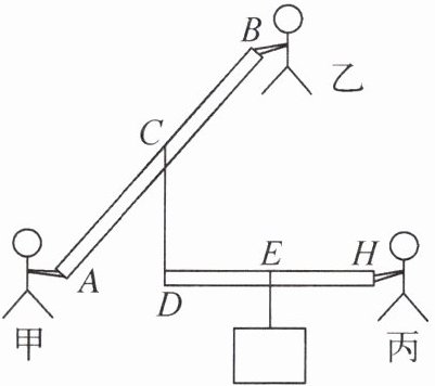 (3)若三人施力皆为F,AB棒平衡时,$2F=F'_{D}+G_{棒}$,DH棒平衡时,$G_{棒}+mg=F'_{D}+F,F'_{D}=\frac {1}{2}(G_{棒}+mg)$,解得$F=G_{棒}=100N,mg=2F-G_{棒}=100N,m=\frac {100N}{10N/kg}=10kg$。