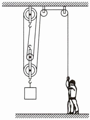 12. 如图所示,质量为60 kg的工人站在水平地面上,用滑轮组把货物运到高处。第一次运送货物时,货物质量为130 kg,工人用力$F_1$匀速拉绳,地面对工人的支持力为$N_1,$滑轮组的机械效率为$η_1。$第二次运送货物时,货物质量为90 kg,工人用力$F_2$匀速拉绳的功率为$P_2,$货物以0.1 m/s的速度匀速上升,地面对工人的支持力为$N_2,N_1$与$N_2$之比为2:3。求:(不计绳重及滑轮摩擦,g取10 N/kg)