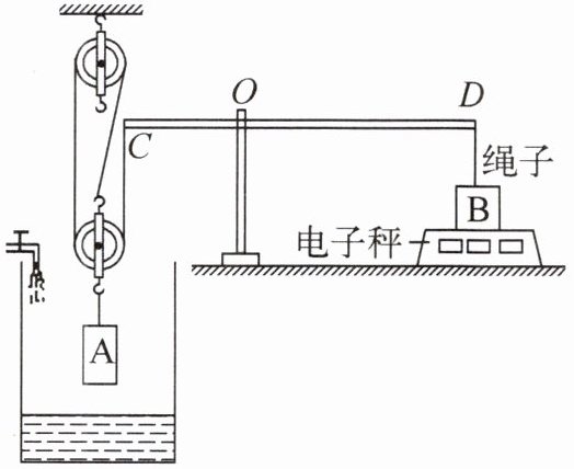 11. 如图所示是利用电子秤监控水库水位的装置,由长方体A和B、滑轮组、轻质杠杆CD、电子秤等组成,杠杆始终在水平位置平衡。已知OC:OD= 1:2,A的体积为$0.02 m^3,A$的重力为400 N,B的重力为150 N,动滑轮重为100 N,不计绳重与一切摩擦,ρ水$= 1.0×10^3kg/m^3,g$取10 N/kg。求: