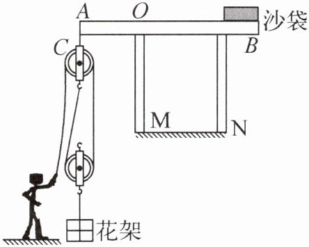 11. 为了建设精致城市,每到春天,园林工人要在过街天桥上放置花草,为城市增添一抹色彩。如图所示,工人用长木棒、滑轮、轻绳组装提升装置。木棒放置在天桥栏杆上始终保持水平,与栏杆M的接触点为O;用沙袋将木棒B端压在栏杆N上,在木棒A端吊装滑轮组。$OA:OB= 1:2$,每个沙袋重300 N,每个滑轮重24 N。(木棒和绳的重力、滑轮与轴的摩擦、沙袋的体积均忽略不计)