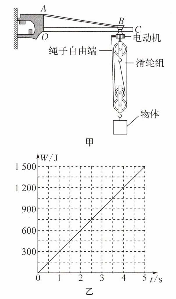 10. (2024·泰州兴化期中)如图甲是一种新型吊运设备的简化模型示意图,图中OC是一根以O点为支点的水平杠杆,AB表示对杠杆起固定作用且不可伸缩的缆绳,OC、AB的长度均为5 m,BC的长度为1 m。图中滑轮组绳子的自由端由电动机拉动,定滑轮的轴和电动机均固定在B点。在一次作业中,该吊运设备匀速竖直提升重为1000 N的物体,此时滑轮组的机械效率为80%,电动机做的功与时间的变化关系如图乙所示。不考虑杠杆的质量、滑轮组绳子的质量、滑轮与轴和绳子间的摩擦。