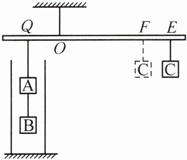 11. 如图所示的装置中,轻质杠杆的支点为O,物块A、B通过轻质细线悬挂于Q点,当柱形薄壁容器中没有水时,物块C悬挂于E点,杠杆在水平位置平衡。当往容器中加入质量为m的水时(水还未浸没物块B),为使杠杆在水平位置平衡,物块C应悬挂于F点,A、B为均匀实心正方体,A、B的边长均为20cm。B的下表面到容器底的距离为20cm,柱形容器的底面积为$S= 600cm^2。$G_A= 1.6N,G_B= 12.8N,OQ= 4cm,OE= 14.4cm,OF= 10.4cm。ρ_水$=1.0×10^3kg/m^3,$杠杆重力对平衡的影响忽略不计,细线重力忽略不计,物块不吸水。求:(g取10N/kg)