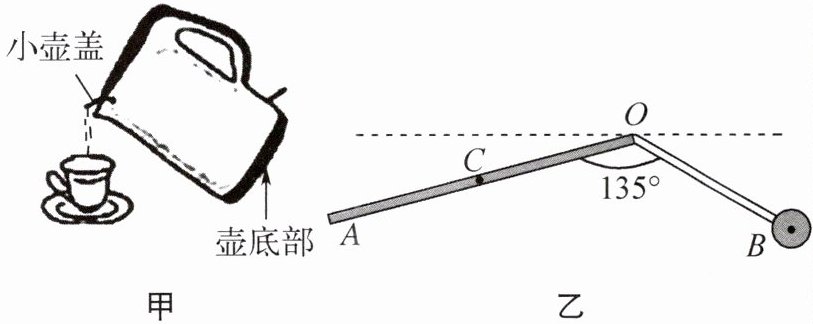 10. 如图甲是一种壶口处配有自动开合小壶盖的电水壶。图乙是自动开合小壶盖的简化侧视图,OA是小壶盖,C是其重力作用点,B是小壶盖的配重,OB是配重柄,AOB能绕固定点O自由转动。