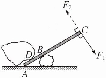 9. 如图所示是用木棒撬石块的示意图。撬石块有两种方法:第一种是以B点为支点,在C点用与木棒垂直的力$F_1$向下撬;第二种是以A点为支点,在C点用与木棒垂直的力$F_2$向上撬(木棒自重不计)。已知AC= 2m,BC= 1.6m,且AD= DB。则: