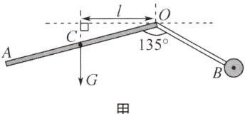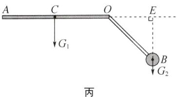 (1)/√2×1.4cm=1cm,因$G_1l_1=G_2l_2,$即$m_1g×OD=m_2g×OB,$则$m_2=(m_1×OD)/OB=(4g×1cm)/1cm=4g;②$当壶盖水平时,杠杆的示意图如图丙所示,此时配重的力臂最小、壶盖重力的力臂最大,即配重的质量最大,OE和OB间的夹角为45°,OE=