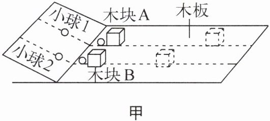 11. 图甲是小丽探究动能大小与速度关系时的实验场景:斜面上有两平行轨道,将两小球1、2从轨道上由静止释放,与放置在水平木板上的两个相同木块A、B发生碰撞,两个木块初始位置到斜面底端的距离相等。